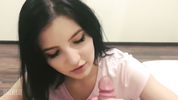 Брюнетка нализывает и насасывает хуй с громким причмоком, до самого окончания в рот