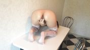 Молоденькая сучка в чулках снимает жаркую мастурбацию бритой киски на кухне