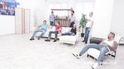 Худенькая шалашовка ублажает семерых мужиков, принимая в анальчик по два хуя сразу