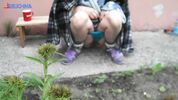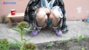 Худенькая девка дрочит и писает, засунув в пизду сразу две пары трусиков